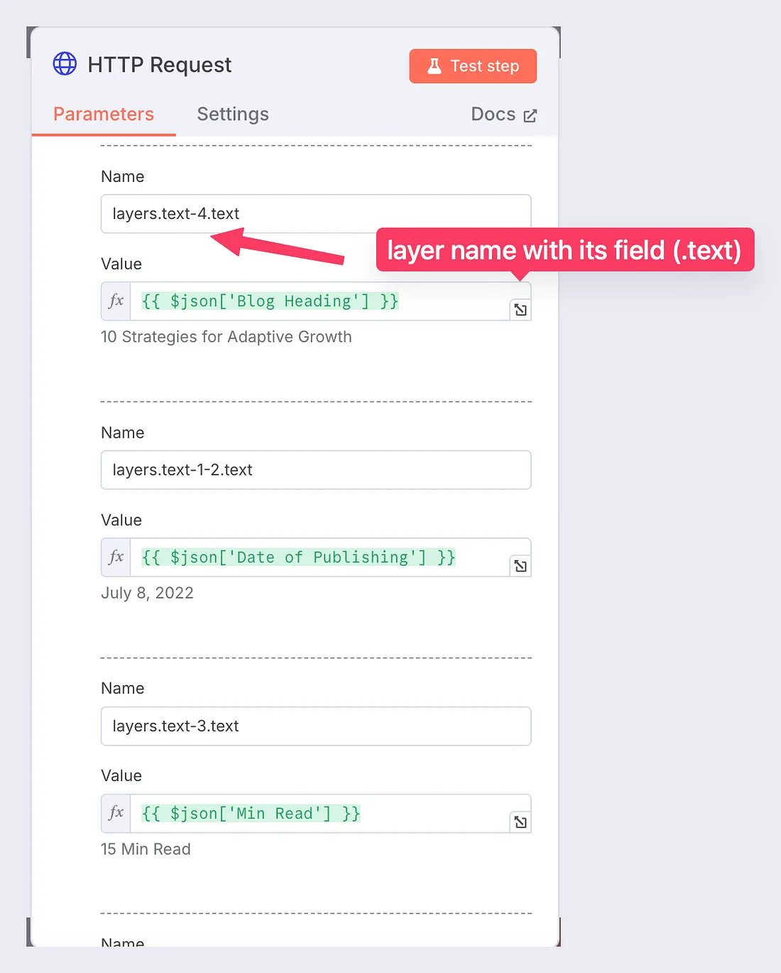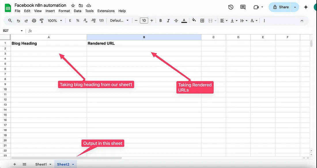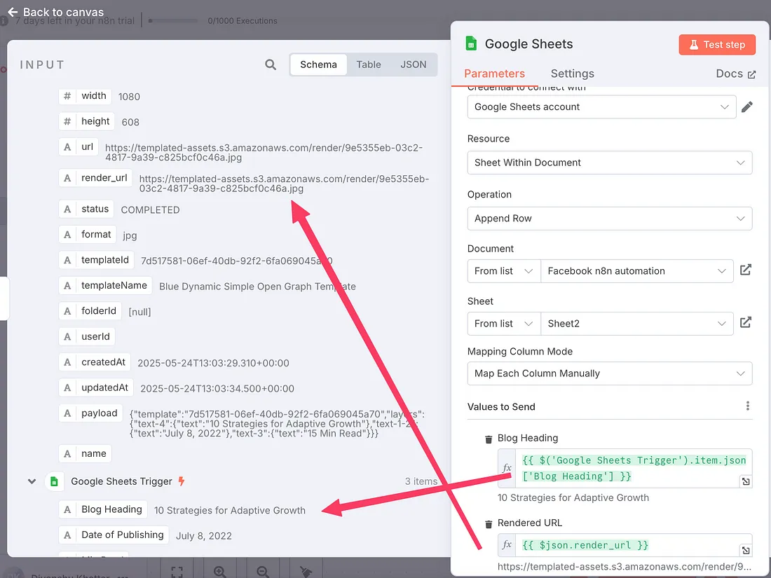 The final step would be to take them back into our Spreadsheet in tab “Sheet2”. Here’s how we will be mapping our last node ‘Google Sheets → Append row’, taking the blog heading from our first node, and the rendered URL from the Templated node. ↓
