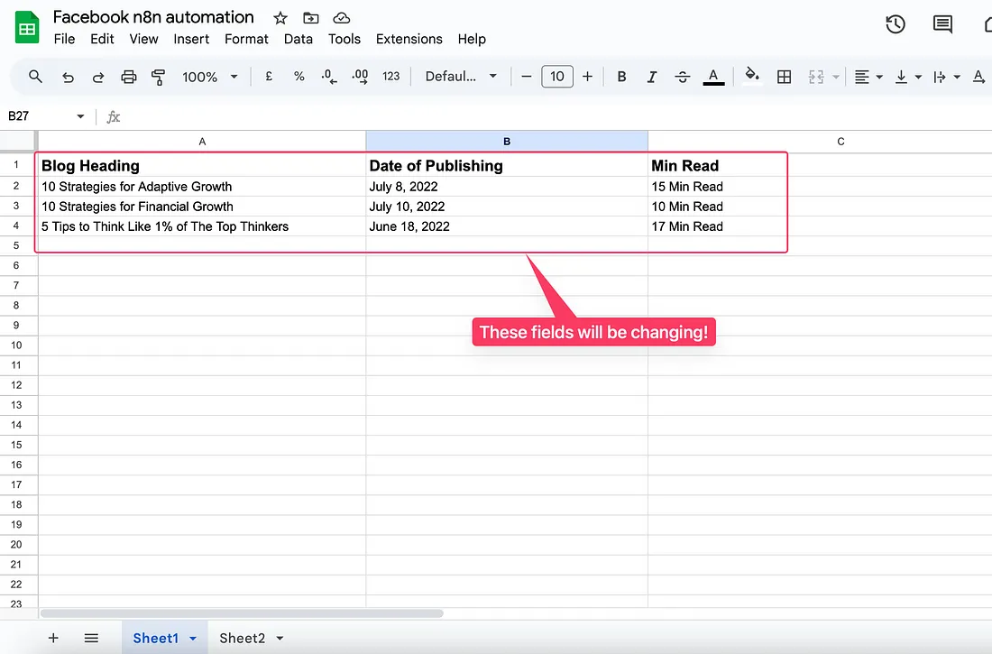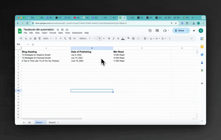 As you can see in the tab “Sheet1”, row 1 has all the layers I want to change. These are ‘Blog Headings’, ‘Date of Publishing’ & ‘Min Read’.