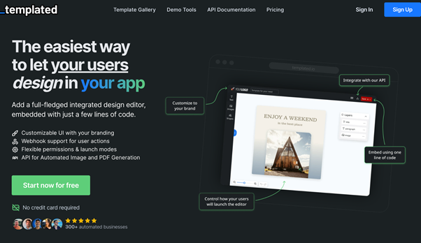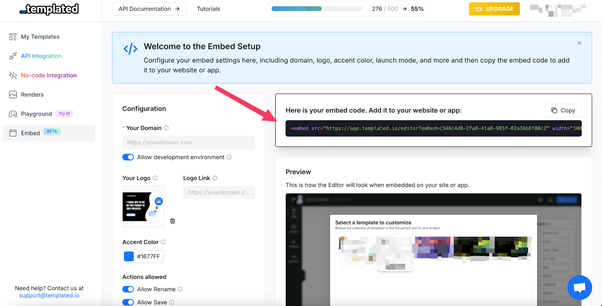 The first on the list is Templated’s embed Image editor, embedding the editor is typically done with a single HTML tag. Templated provides an <embed> snippet pointing to their editor URL with your unique embed ID.